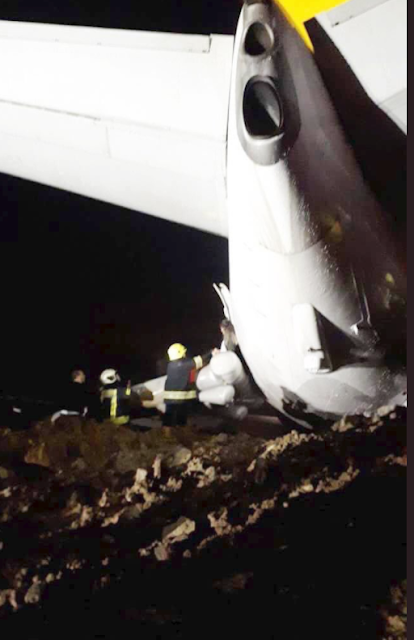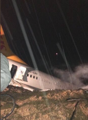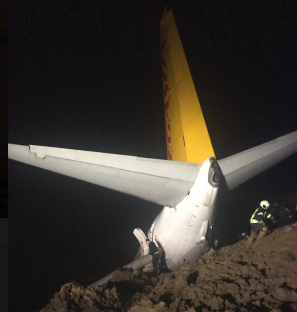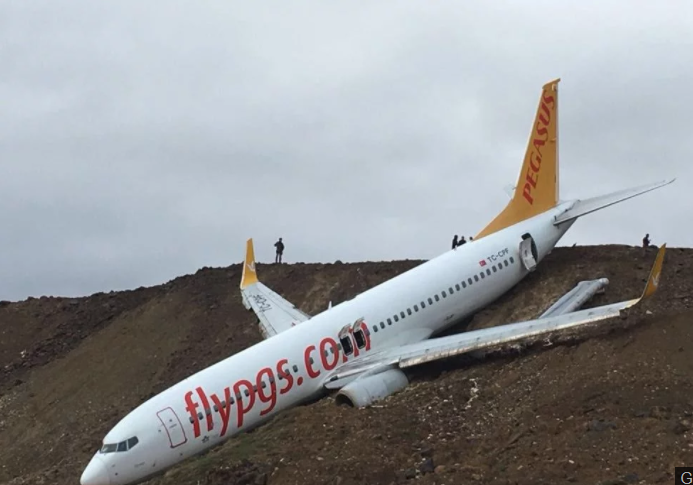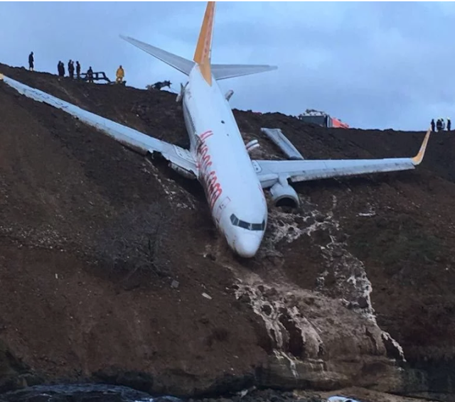 The 162 people on board the plane had a lucky escape when the wheels of the Pegasus Airlines flight dug into the mud at Trabzon Airport, leaving it dangling off a cliff.